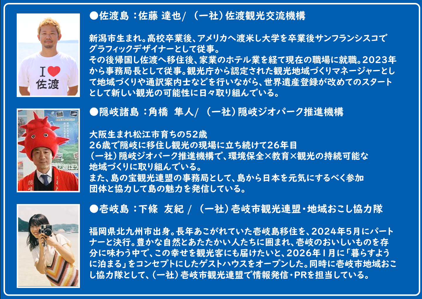 認定NPO法人離島経済新聞社 /(株)Officeひるねこ /(一社)佐渡観光交流機構 /(一社)隠岐ジオパーク推進機構 /(一社)壱岐市観光連盟 / 五島観光連盟 /(一社)天草宝島観光協会 /(一社)天草四郎観光協会 / (一社)離島百貨店 / 合同会社harukana