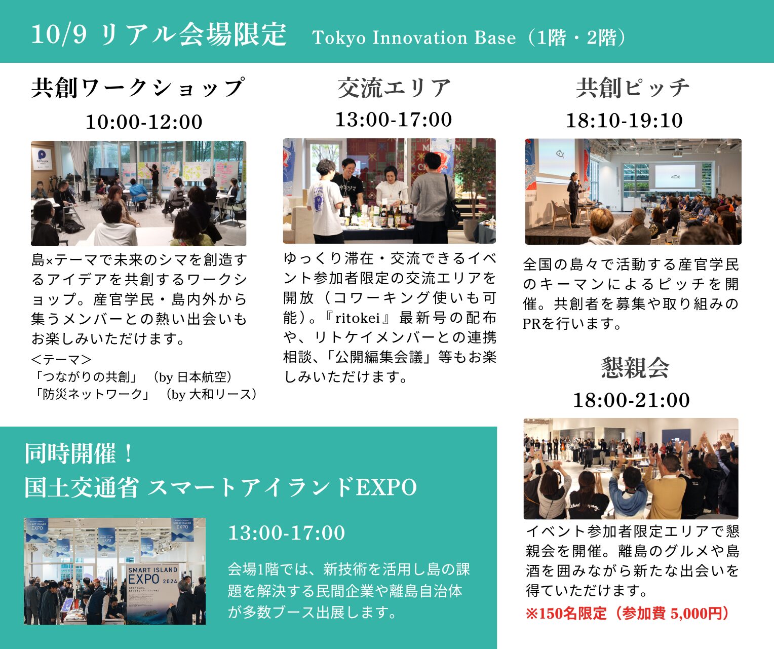 10月9日のリアル会場(Tokyo Innovation Base)では、島々から来場する参加者や、持続可能な地域振興に興味関心のある企業や行政、島のファンが集います。
