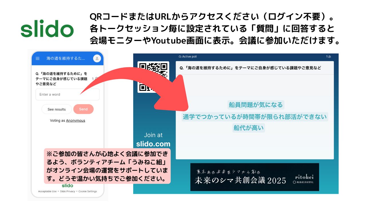 「未来のシマ共創会議2025」では、ログイン不要でコメントを届けられる「Slido」アプリでご意見・アイデア・感想などをお寄せいただけます。